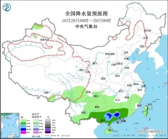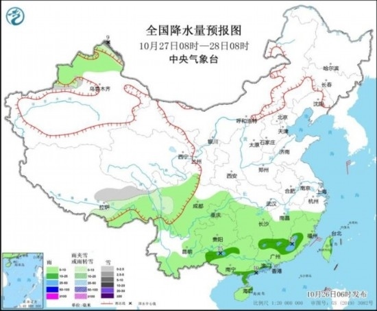 10月27日08時(shí)至28日08時(shí),新疆北疆北部、西藏東部等地部分地區(qū)有小到中雪或雨夾雪,局地大雪(5~9毫米)。西南地區(qū)大部、江南大部、華南等地有小到中雨,局地大雨。