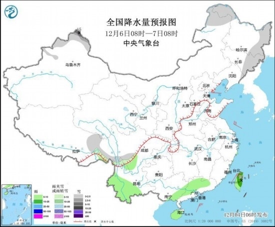 全國(guó)降水量預(yù)報(bào)圖(12月6日08時(shí)-7日08時(shí))