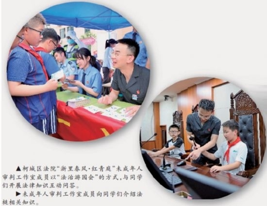 “‘紅青庭’品牌Logo中,‘紅’字既突出黨建統(tǒng)領(lǐng)又寓意紅領(lǐng)巾,是百折不撓的精神象征;‘青’字代表著青少年,是肩負(fù)未來(lái)的青春力量;‘庭’字則是指少年法庭和家庭。”胡衛(wèi)民介紹,柯城區(qū)法院依托“浙里春風(fēng)·紅青庭”品牌,成立青少年法治教育實(shí)踐基地和未成年人審判工作室,積極開(kāi)展內(nèi)外聯(lián)動(dòng),在持續(xù)加強(qiáng)涉未成年人刑事、民事、行政審判融合的基礎(chǔ)上,不斷深化與公安、檢察、教育、團(tuán)委、婦聯(lián)等部門(mén)的協(xié)調(diào)配合,構(gòu)筑全方位、多鏈條的綜合司法保護(hù)機(jī)制。