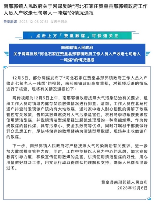 ·河北石家莊贊皇一工作人員入戶收走7旬老人一噸過冬煤?官方:現(xiàn)場未收繳。