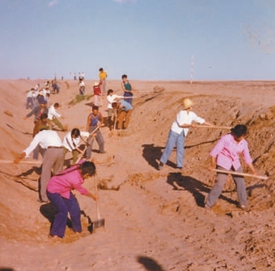 上世紀(jì)80年代,磴口縣干部群眾在挖掘灌溉渠。中國(guó)林科院沙漠林業(yè)實(shí)驗(yàn)中心供圖