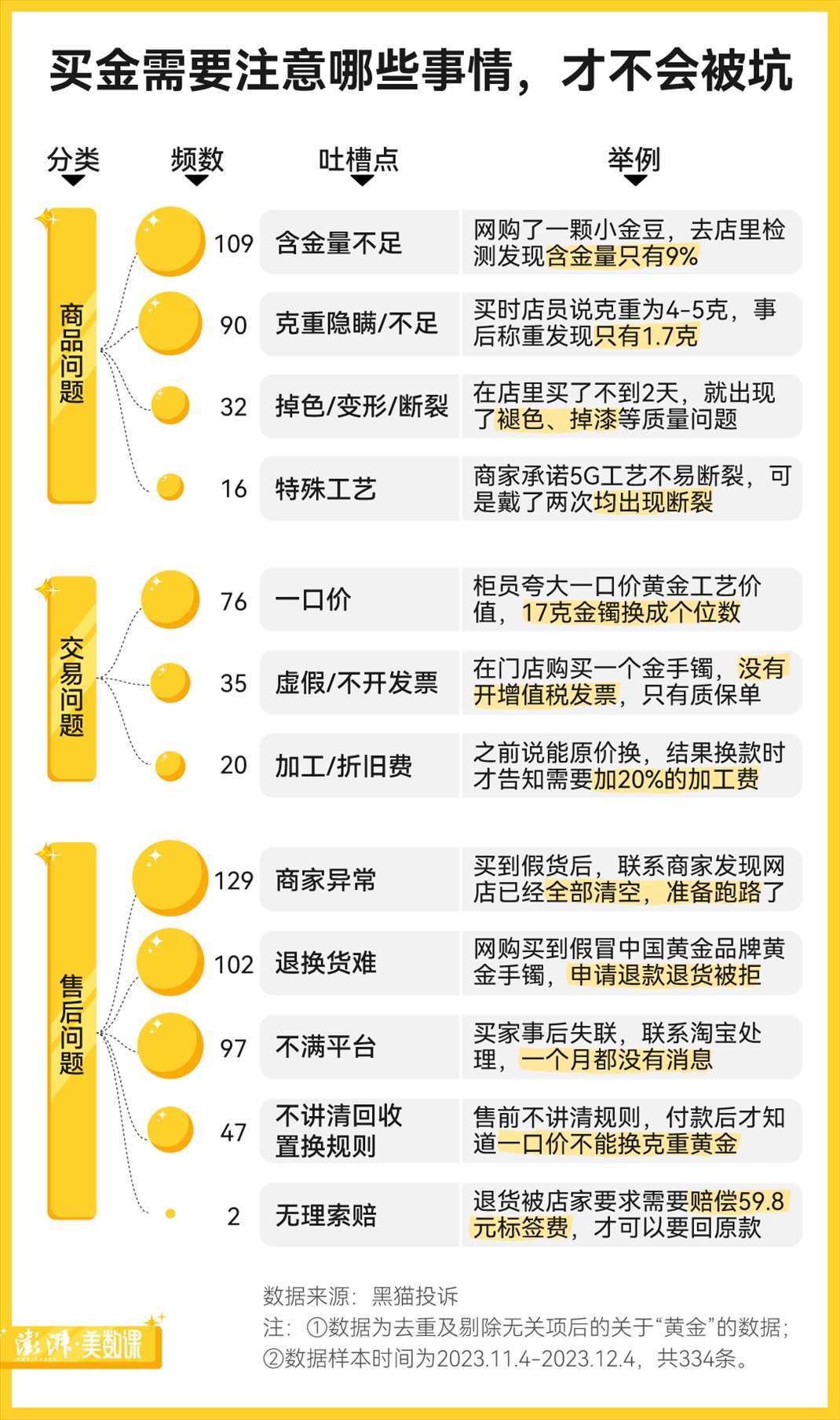 通過梳理黑貓投訴2023年所有關(guān)于“黃金”的消費糾紛,澎湃新聞發(fā)現(xiàn)無論是在網(wǎng)購還是線下,品牌店還是非品牌店,購買黃金都有可能踩坑。