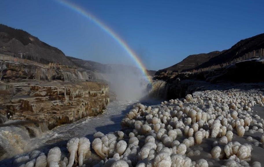 黃河壺口瀑布呈現彩虹冰掛美景。