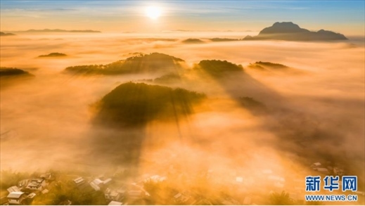 冬日的清晨,云南省普洱市寧洱哈尼族彝族自治縣山間的村莊被云霧籠罩,日出云海,壯美如畫。