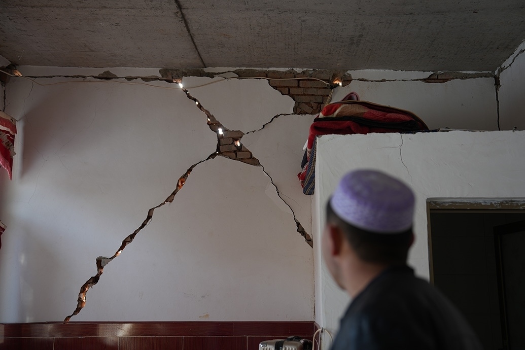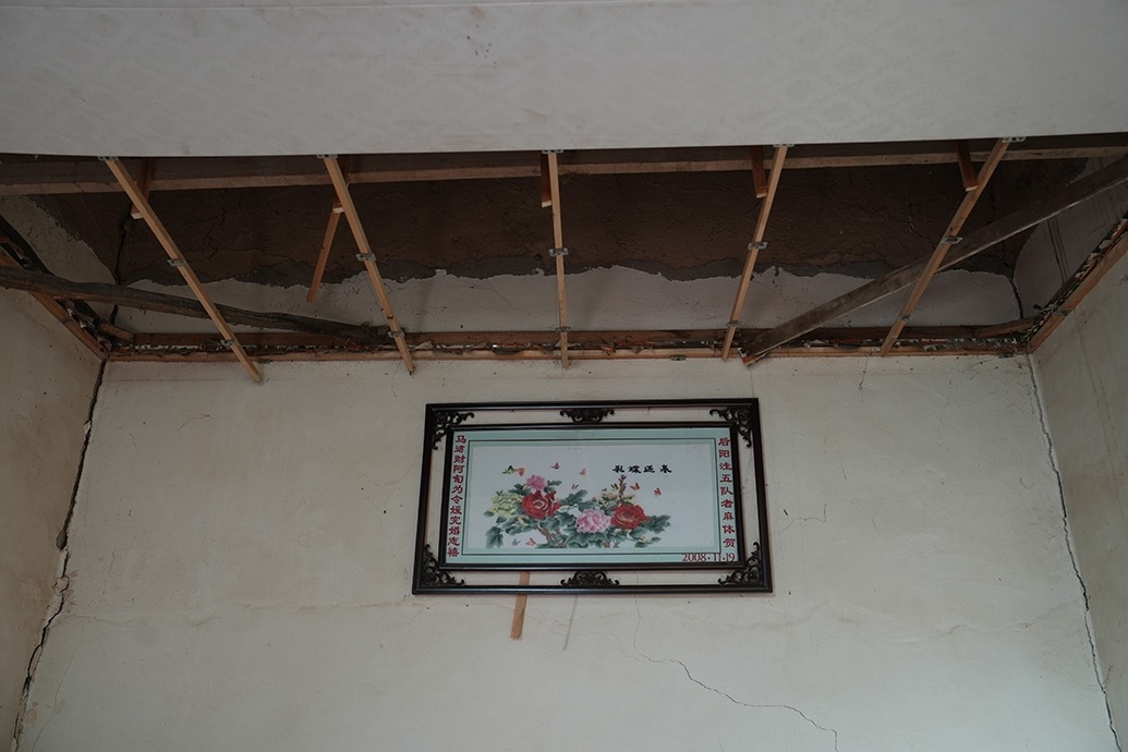 震后,他家木頭架構(gòu)的屋頂傾斜了些,磚瓦墻多處開裂,土炕也裂了,柴火的煙從裂縫滲出,有些嗆人。原則上,他家是不能再進入了,但上課的話,房間更舒適暖和點。