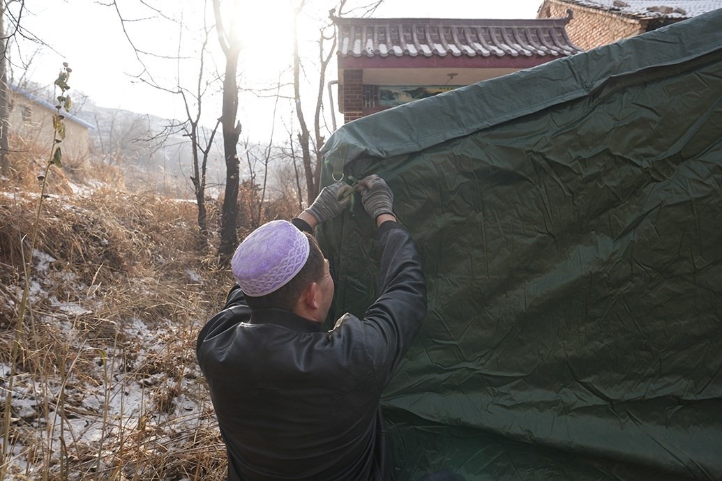 12月20日,馬國忠一家回到村里,拿塑料布在家附近搭了個簡易帳篷,兩根木頭、一條橫梁支起來,怕煙筒把塑料烤化,帳篷里不能烤火,頂多防風(fēng),但馬國忠覺得比車?yán)飶姸嗔?。家里的電熱毯拿出來鋪上,他才睡了個安穩(wěn)覺。只是半夜來了余震,又醒了。他止不住想:下一步怎么辦?后面會不會繼續(xù)搖?他家鋼管焊的牛棚頂晃得“乒乒乓乓”響。