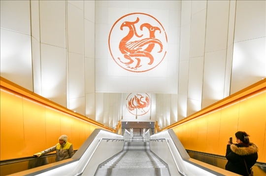17號線太陽宮站里,仿佛照射進(jìn)太陽金光,站廳里的暖陽壁畫、上下扶梯時墻壁上的神鳥瓦當(dāng),都有不少乘客舉著手機拍照。