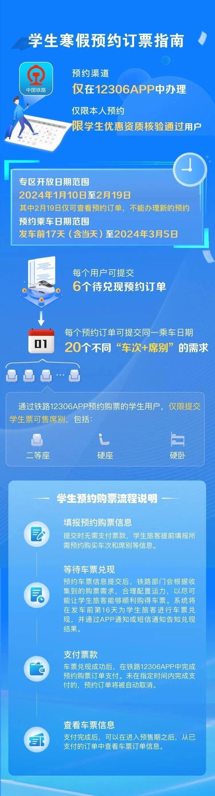 為認真貫徹落實黨中央國務(wù)院關(guān)于做好2024年元旦春節(jié)期間有關(guān)工作的要求,保障學生、務(wù)工人員等重點群體春運出行,鐵路12306創(chuàng)新服務(wù)舉措,為學生、務(wù)工人員推出了售票服務(wù)專區(qū)。自1月10日起,符合條件的學生旅客(已通過學生優(yōu)惠資質(zhì)核驗且有剩余優(yōu)惠乘車次數(shù))可通過“學生寒假訂票專項服務(wù)”專區(qū)預(yù)約購買春運期間(1月26日至3月5日)火車票,每名旅客最多可同時提交6個預(yù)約訂單,每個訂單可添加1個乘車日期的20個“車次+席別”的組合,可選席別為學生優(yōu)惠票適用的硬座、硬臥、二等座。已通過實名制核驗的務(wù)工人員可通過“務(wù)工人員春運預(yù)約訂票服務(wù)”專區(qū)預(yù)約購買春運期間火車票,每名旅客可同時提交6個預(yù)約訂單,每個訂單可選擇“時間+車次+席別”的1個組合。