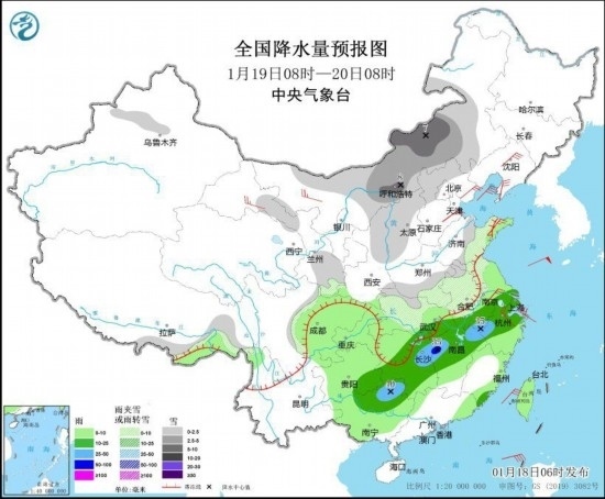 圖1 全國降水量預(yù)報圖(1月18日08時-19日08時)
