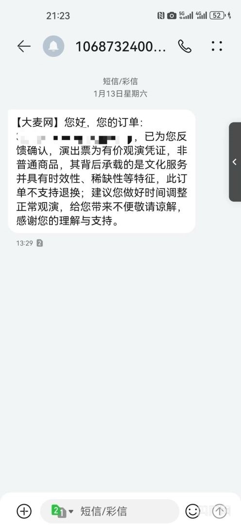 周女士說(shuō)自己第一時(shí)間就通過(guò)多個(gè)渠道嘗試退票,但都沒(méi)有成功。“人工客服的工作時(shí)間是早上9點(diǎn)到晚上8點(diǎn),我打電話的時(shí)候不在他們工作時(shí)間范圍內(nèi)。當(dāng)時(shí)也確實(shí)聯(lián)系不到其他渠道,于是我就在12315,包括黑貓投訴進(jìn)行退票退款的申請(qǐng)。13號(hào)早上9點(diǎn),大麥客服說(shuō)此訂單不支持退換,13號(hào)下午1點(diǎn)半的時(shí)候,給了我一個(gè)反饋短信,說(shuō)是已為我反饋確認(rèn),演出票為有價(jià)觀影憑證非普通商品,其背后承載的是文化服務(wù),并具有時(shí)效性、稀缺性等特征,此訂單不支持退換,然后就建議我做好時(shí)間調(diào)整正常觀演。”