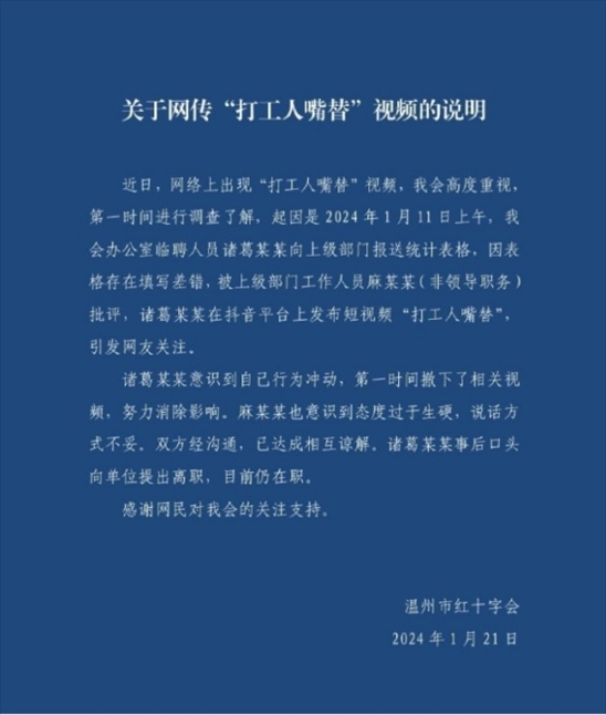 ·溫州市紅十字會(huì)回應(yīng)網(wǎng)傳“打工人嘴替”視頻:表格填錯(cuò)被批評(píng)引發(fā),雙方認(rèn)識(shí)到自己不足已諒解。