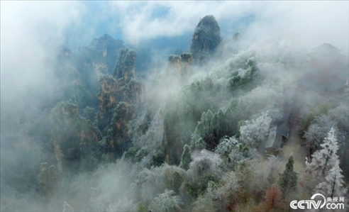2024年1月20日,大寒節(jié)氣,張家界國(guó)家森林公園出現(xiàn)低溫冰雪天氣,天子山、袁家界、黃石寨一帶出現(xiàn)大面積霧凇冰掛景觀。