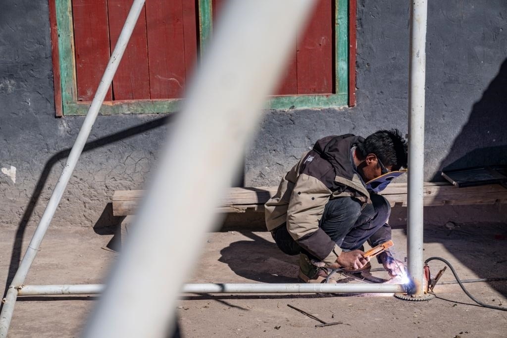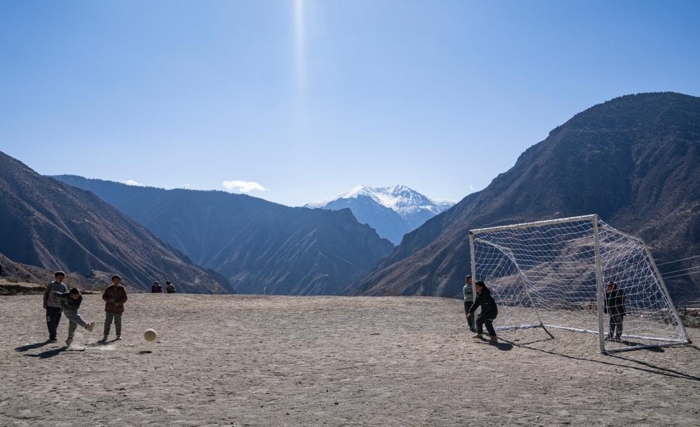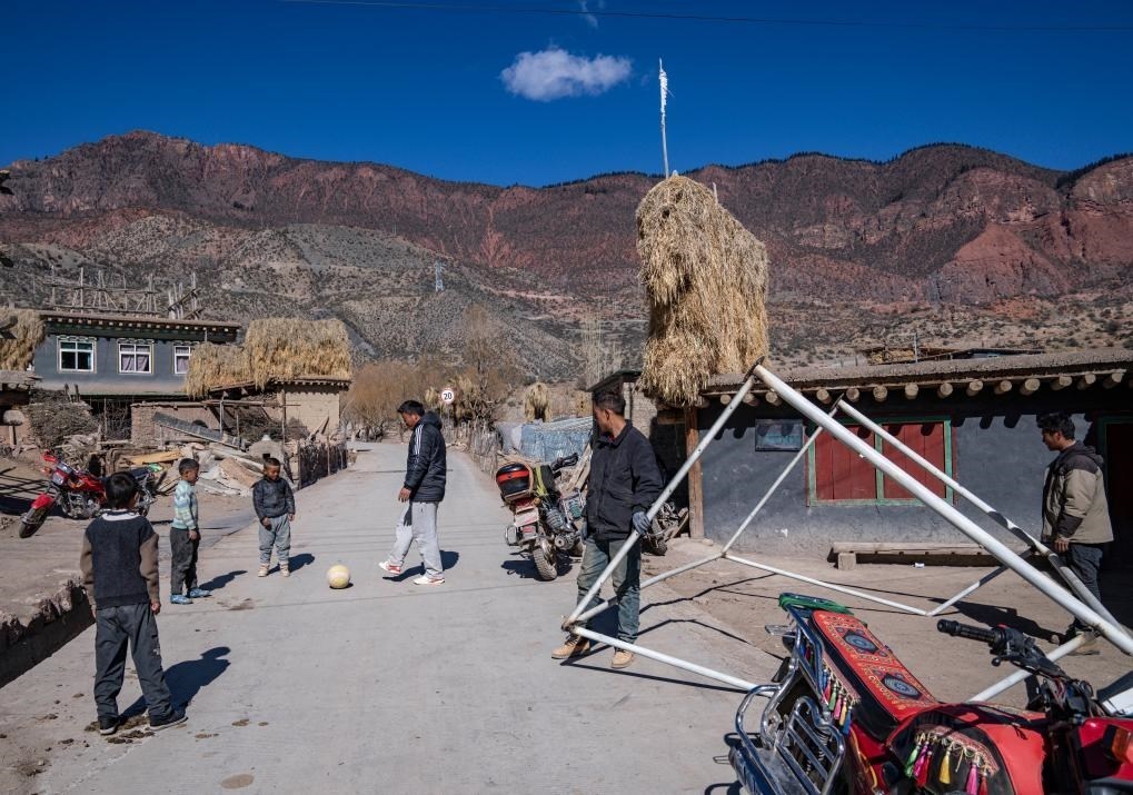 等待焊接的一會(huì)兒工夫,村里的孩子們也要跑來(lái)和嘎瑪群美踢兩腳