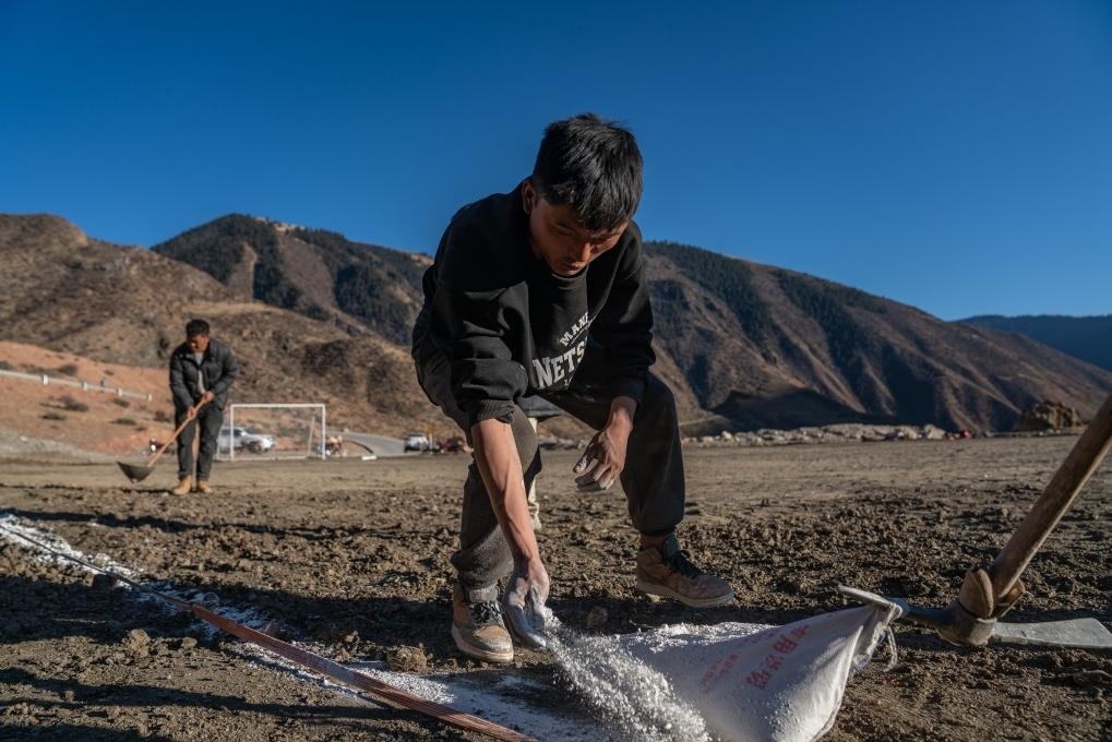 嘎瑪群美(中)和球員們正在平整球場(chǎng)(1月20日攝)