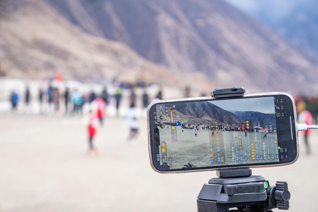 在馬利村的足球場(chǎng)邊,一名村民用手機(jī)直播比賽(1月21日攝)
