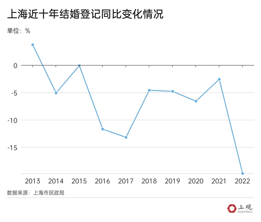 2022年,上海結(jié)婚領(lǐng)證的新人共有7.2萬對,是自1990年以來的最低值。雖說近20年來,結(jié)婚人數(shù)處于波動下降的趨勢,但2022年的降幅不尋常,遠(yuǎn)超近十年平均水平(約為5%),相比2021年下降了約20%。