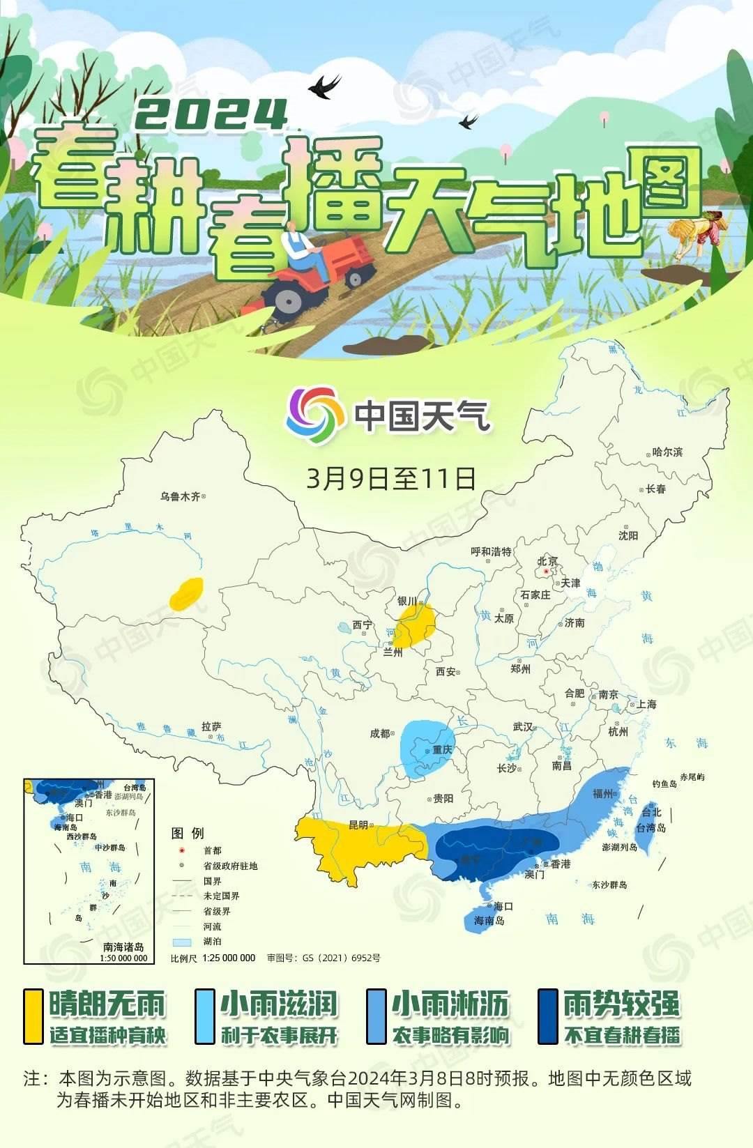 “微雨眾卉新,一雷驚蟄始。田家?guī)兹臻e,耕種從此起。”到了驚蟄時節(jié),我國春耕春播工作已陸續(xù)展開,從華南到西北,田間地頭逐漸忙碌了起來。一年之計在于春,春耕春播工作對于全年糧食豐收至關(guān)重要。中國天氣網(wǎng)推出2024全國春播進程圖和春耕春播天氣地圖,看各地春播何時展開,近期春播天氣如何。