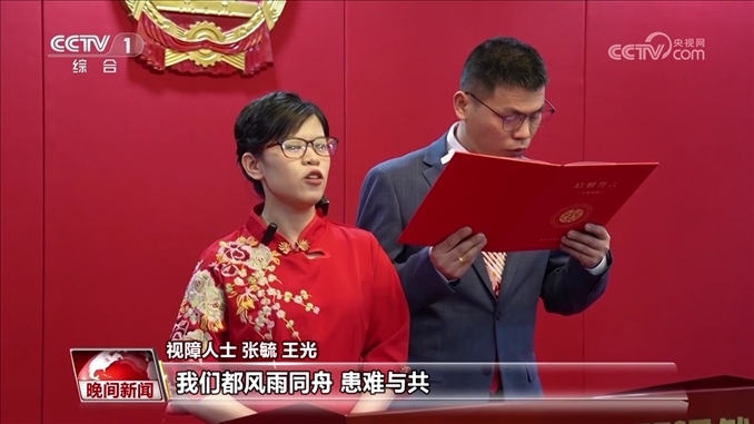 視障人士 張毓 王光:相濡以沫,鐘愛一生,今后無論順境還是逆境,無論富有還是貧窮,無論健康還是疾病,無論青春還是年老,我們都風(fēng)雨同舟,患難與共,成為終生的伴侶。