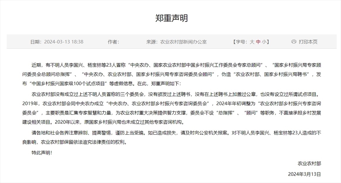 ·農(nóng)業(yè)農(nóng)村部鄭重聲明:沒有成立過不明人員冒稱的“中央農(nóng)辦、國家農(nóng)業(yè)農(nóng)村部中國鄉(xiāng)村振興工作委員會專家總顧問”、“國家鄉(xiāng)村振興局專家顧問委員會總顧問總指揮”、“中央農(nóng)辦、農(nóng)業(yè)農(nóng)村部、國家鄉(xiāng)村振興局專家咨詢委員會顧問”三個委員會,沒有頒發(fā)過上述聘書,沒有在上述聘書上加蓋過公章,也沒有設立過所謂試點項目。