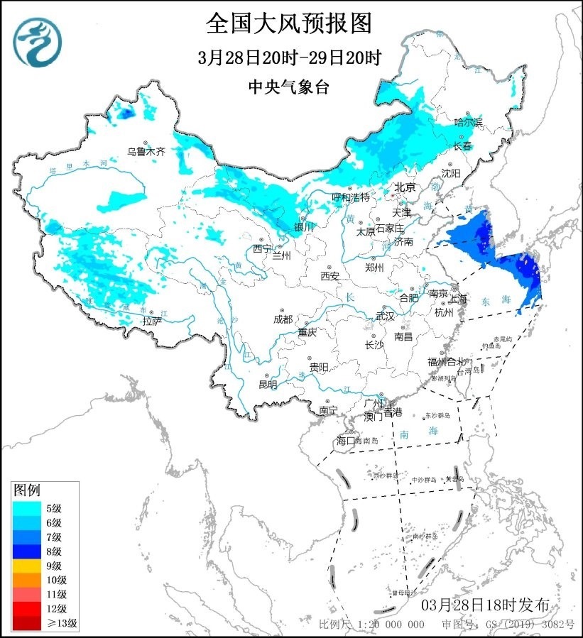 預(yù)計(jì),3月28日20時(shí)至29日20時(shí),內(nèi)蒙古大部、吉林西部、遼寧南部、甘肅東部、寧夏北部等地有5~6級、陣風(fēng)7~9級風(fēng);黃海中部和南部海域、東海東北部海域?qū)⒂?~8級、陣風(fēng)9級風(fēng),其中東海東北部的部分海域風(fēng)力可達(dá)9級、陣風(fēng)10級。