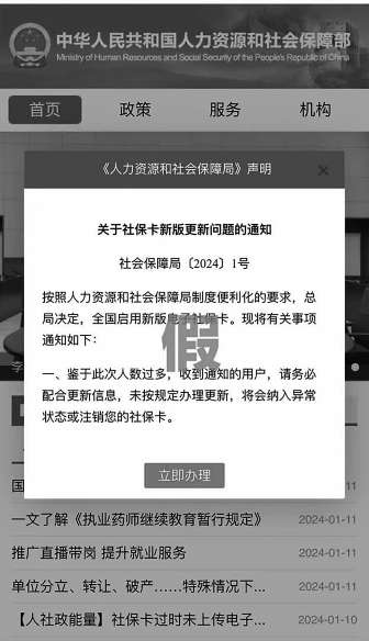套路二 仿冒人力資源和社會保障部官網(wǎng),并在仿冒網(wǎng)站上設置釣魚網(wǎng)頁,誘騙當事人填寫姓名、身份證號等信息,再利用竊取的個人信息實施詐騙。持卡人在收到類似詐騙短信時,可通過撥打12333服務熱線或前往人社服務大廳核實等方式,確認社??顟B(tài)是否正常。
