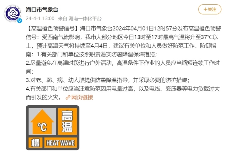 央視網(wǎng)消息:據(jù)@??谑袣庀笈_ 微博消息,??谑袣庀笈_2024年04月01日12時57分發(fā)布高溫橙色預(yù)警信號:受西南氣流影響,??谑写蟛糠值貐^(qū)今日13時至17時最高氣溫將升至37℃以上,預(yù)計高溫天氣將持續(xù)至4月4日,建議有關(guān)單位和人員做好防范工作。