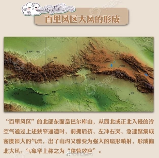 “百里風(fēng)區(qū)”的北部東面是巴爾庫山,從冷空氣通過上述狹窄通道時,前擁后擠,左沖右突,急速聚集成密度很大的氣流,出了山溝又驟變?yōu)閺姶蟮纳刃螄娚洹?/p>
