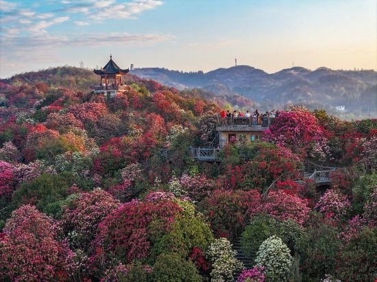 貴州烏蒙山區(qū),百里杜鵑景區(qū)的野生杜鵑花相繼綻放,如同一條彩帶飄舞山間,這里有面積大、種類多、保存完好的原始杜鵑林。景區(qū)管理單位舉行了祭花神等豐富的民俗活動。