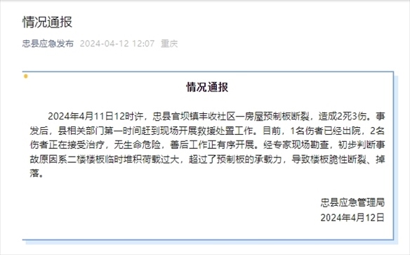 央視網(wǎng)消息:據(jù)“忠縣應急發(fā)布”公眾號消息,重慶忠縣應急管理局通報,2024年4月11日12時許,忠縣官壩鎮(zhèn)豐收社區(qū)一房屋預制板斷裂,造成2死3傷。事發(fā)后,縣相關(guān)部門第一時間趕到現(xiàn)場開展救援處置工作。目前,1名傷者已經(jīng)出院,2名傷者正在接受治療,無生命危險,善后工作正有序開展。經(jīng)專家現(xiàn)場勘查,初步判斷事故原因系二樓樓板臨時堆積荷載過大,超過了預制板的承載力,導致樓板脆性斷裂、掉落。