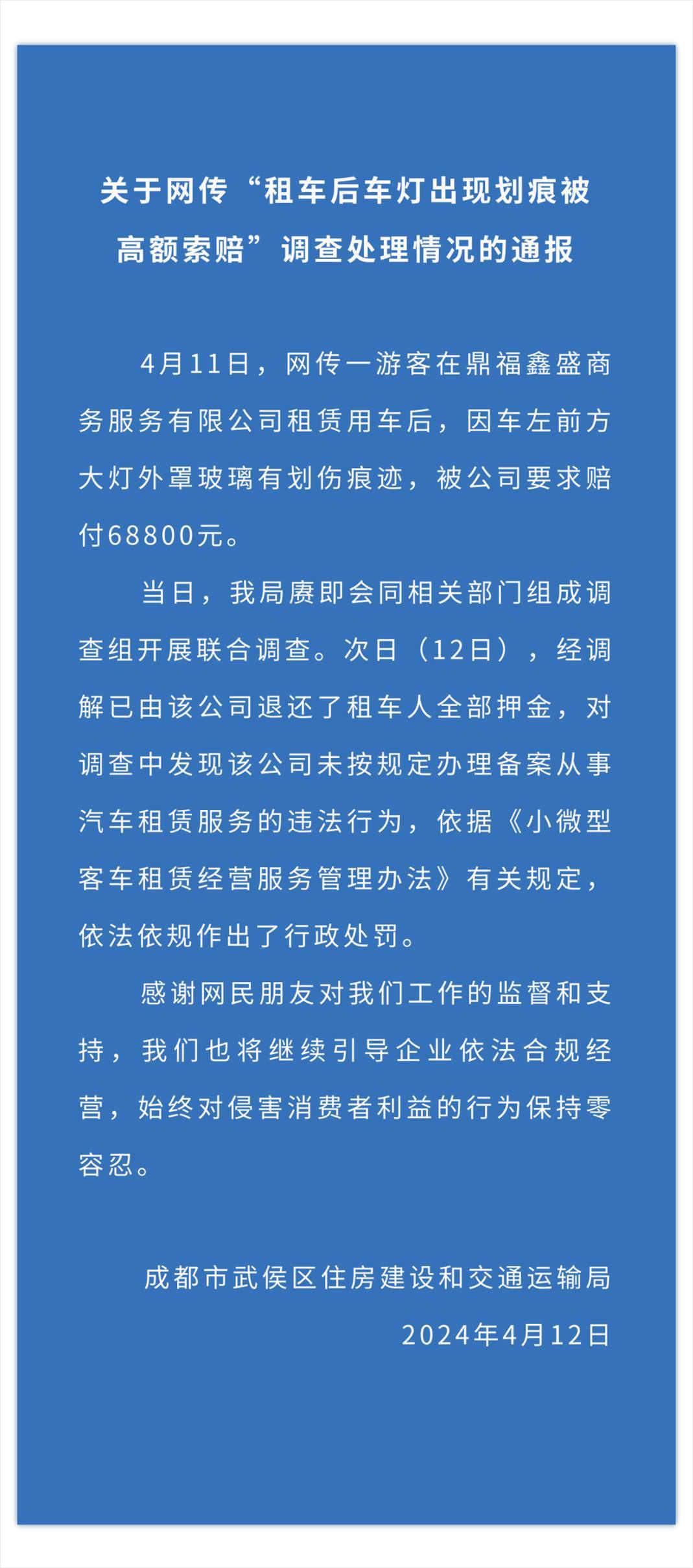 央視網(wǎng)消息:成都市武侯區(qū)住房建設(shè)和交通運輸局4月12日晚發(fā)布通報,4月11日,網(wǎng)傳一游客在鼎福鑫盛商務(wù)服務(wù)有限公司租賃用車后,因車左前方大燈外罩玻璃有劃傷痕跡,被公司要求賠付68800元。當(dāng)日,我局賡即會同相關(guān)部門組成調(diào)查組開展聯(lián)合調(diào)查。次日(12日),經(jīng)調(diào)解已由該公司退還了租車人全部押金,對調(diào)查中發(fā)現(xiàn)該公司未按規(guī)定辦理備案從事汽車租賃服務(wù)的違法行為,依據(jù)《小微型客車租賃經(jīng)營服務(wù)管理辦法》有關(guān)規(guī)定,依法依規(guī)作出了行政處罰。
