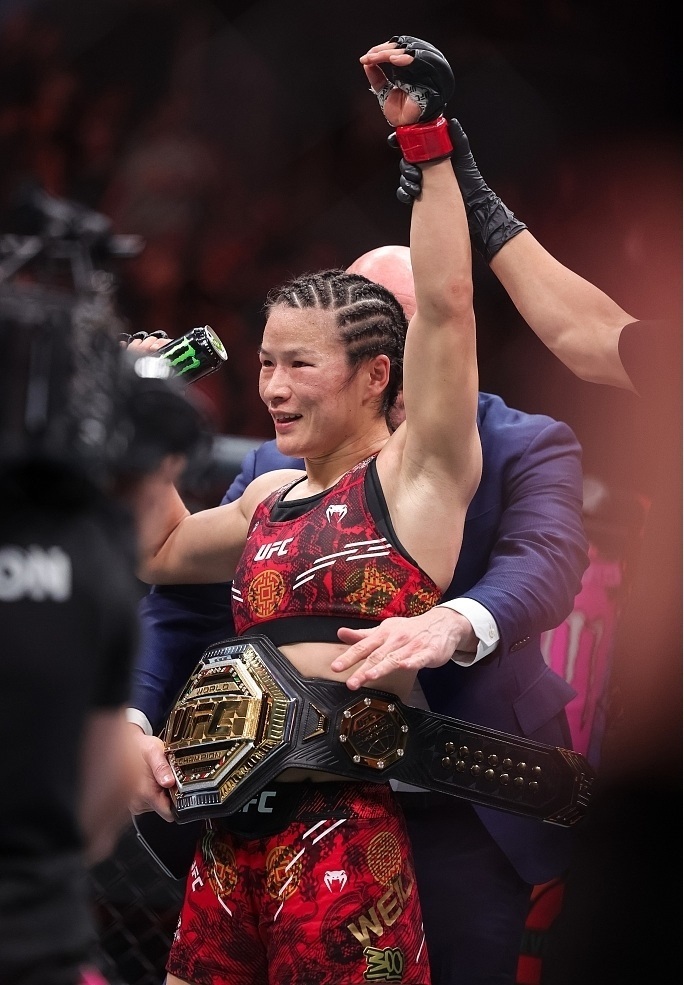 北京時間14日,UFC(終極格斗冠軍賽)史上首次“中國德比”冠軍戰(zhàn)在美國拉斯維加斯上演。兩位選手攜手奉獻了一場精彩的比賽,經(jīng)過五回合鏖戰(zhàn),張偉麗戰(zhàn)勝閆曉楠,成功衛(wèi)冕女子草量級金腰帶。