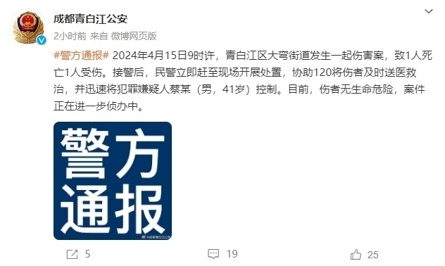 ·警方通報:成都青白江發(fā)生一起傷害案致1死1傷。