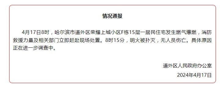 央視網(wǎng)消息:據(jù)“記憶道外”官微消息,哈爾濱市道外區(qū)人民政府辦公室發(fā)布情況通報,4月17日8時,哈爾濱市道外區(qū)榮耀上城小區(qū)F棟15層一居民住宅發(fā)生燃?xì)獗?,消防救援力量及相關(guān)部門立即趕赴現(xiàn)場處置。8時15分,明火被撲滅,無人員傷亡。具體原因正在進(jìn)一步調(diào)查中。