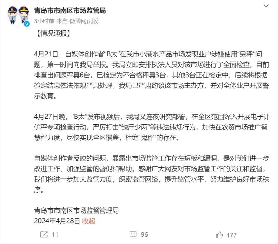青島市市南區(qū)市場監(jiān)督管理局安排執(zhí)法人員對該市場進(jìn)行了全面檢查,目前排查出問題秤具6臺,已檢定為不合格秤具3臺,其他3臺正在檢定中,后續(xù)將根據(jù)檢定結(jié)果依法依規(guī)嚴(yán)肅處理。
