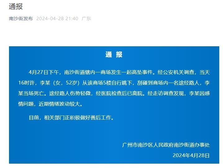 央視網消息:廣州南沙街道4月28日晚通報,4月27日下午,南沙街道轄內一商場發(fā)生一起高墜事件。經公安機關調查,當天16時許,李某(女,52歲)從該商場5樓自行跳下,刮碰到商場內一名途經路人,李某當場死亡。途經路人傷勢輕微,經醫(yī)院檢查后已離院。經走訪調查發(fā)現,李某因感情問題,近期情緒波動較大。目前,相關部門正積極做好善后工作。