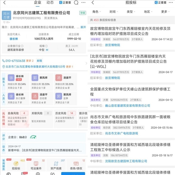 企查查信息顯示,北京同興古建筑工程有限責任公司成立于1999年,法定代表人為徐長林。招投標信息顯示,該公司先后中標全國多地文保單位修繕工程,其中包含故宮博物院、全國重點文保單位天峰山古建筑群、原齊魯大學近現代建筑群等。