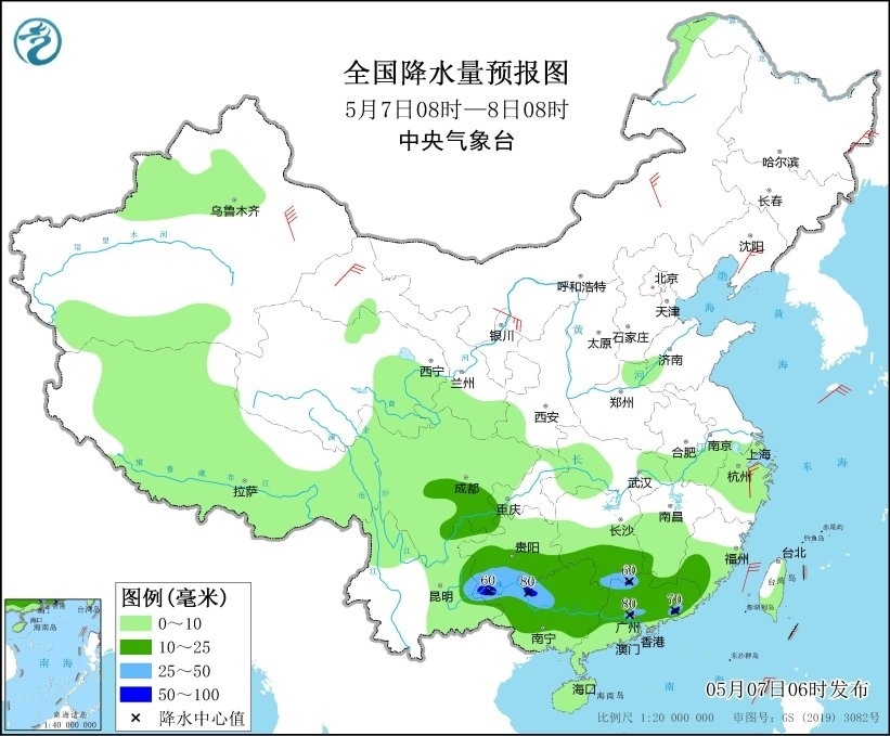 人民網(wǎng)北京5月7日電 (溫璐、高清揚)據(jù)中央氣象臺網(wǎng)站消息,昨日,廣西中南部、廣東中西部、海南島中部及貴州中北部、云南東南部等地部分地區(qū)出現(xiàn)大到暴雨,廣西玉林,廣東肇慶、佛山、清遠,海南白沙,貴州黔南州、畢節(jié)等局地大暴雨。預計未來三天,南方降雨呈現(xiàn)西強東弱的趨勢,江南、華南等地降雨有所減弱,轉(zhuǎn)為陰雨天氣,西南地區(qū)降雨增多,四川盆地南部、云南中部和東部、貴州西部和南部等地有中到大雨,局地暴雨。