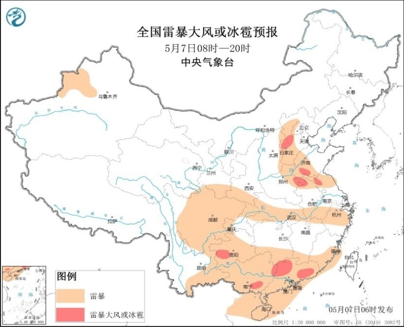 另外,今天白天,河北中部、山東西南部、河南東部、安徽北部、江蘇北部、貴州西南部、廣西中南部、廣東中北部等地的局地將有雷暴大風或冰雹天氣,提醒當?shù)毓娨⒁夥烙箫L或冰雹天氣。