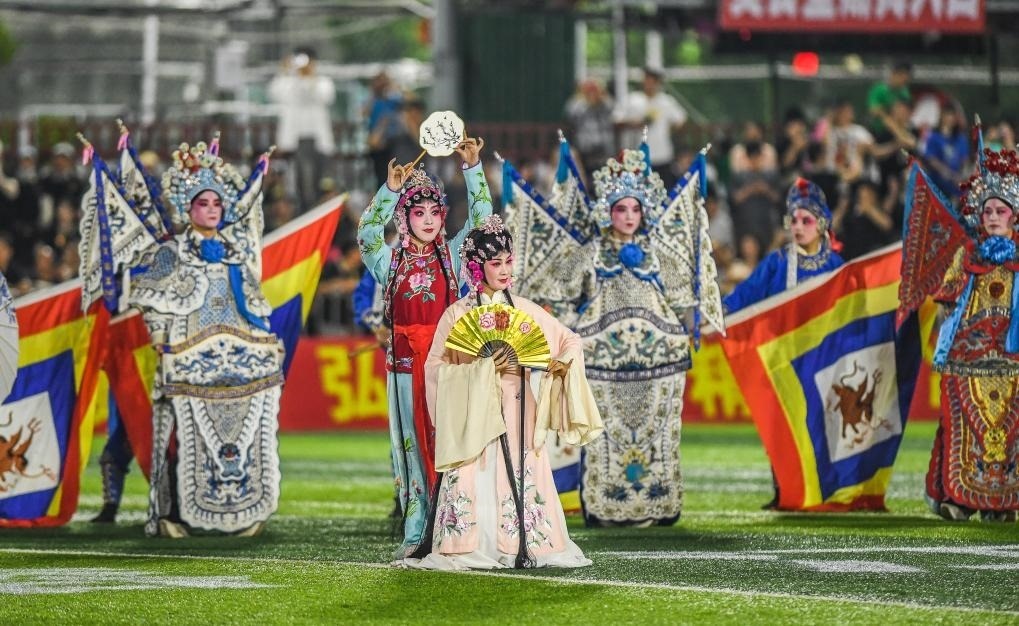 遼寧東港草莓足球隊(duì)帶來嗩吶表演、中山大學(xué)鳳慶滇紅茶足球隊(duì)帶來蘆笙舞、畢節(jié)南山羊肉粉足球隊(duì)帶來彝族舞蹈……在“帶著非遺上村超”“來村超約場球”等活動的聚力匯智作用下,榕江攜手各地推動了“村超”流量的共建共享。