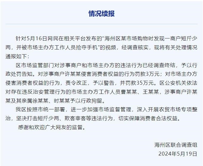 央視網(wǎng)消息:據(jù)“今日海州”微信公眾號(hào)消息,針對(duì)5月16日網(wǎng)民在相關(guān)平臺(tái)發(fā)布的“海州區(qū)某市場(chǎng)購(gòu)物時(shí)發(fā)現(xiàn)一商戶短斤少兩,并被市場(chǎng)主辦方工作人員搶奪手機(jī)”的視頻,經(jīng)調(diào)查核實(shí),現(xiàn)將有關(guān)處理情況通報(bào)如下:區(qū)市場(chǎng)監(jiān)管部門對(duì)涉事商戶和市場(chǎng)主辦方的違法行為已經(jīng)調(diào)查終結(jié),予以行政處罰告知。對(duì)涉事商戶許某某侵害消費(fèi)者權(quán)益的行為罰款3萬元;對(duì)市場(chǎng)主辦方侵害消費(fèi)者權(quán)益的行為,責(zé)令改正,予以警告,并罰款35萬元。區(qū)公安機(jī)關(guān)依法對(duì)存在違反治安管理行為的市場(chǎng)主辦方工作人員曹某某、王某某,涉事商戶許某某及其親屬徐某某、時(shí)某某予以行政拘留。