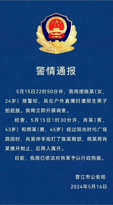·晉江警方通報“殘疾女子街頭直播遭男子拍臀”:男子被行拘。