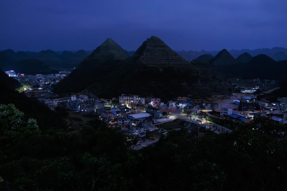 這是在夜色中拍攝的安龍縣郊外形狀酷似金字塔的山體(無人機照片,5月14日攝)。新華社記者 劉續(xù) 攝