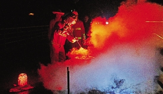 表演結(jié)束,取出上千攝氏度的坩堝準(zhǔn)備滅火。
