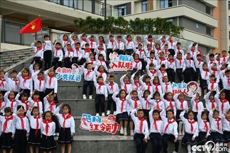 四川省內(nèi)江市東興區(qū)牛牦山小學,新入隊的少先隊員們一起分享獲得紅領(lǐng)巾的喜悅。