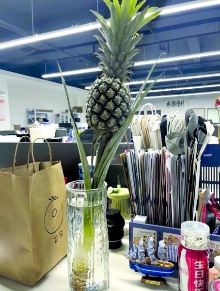 00后楊三日從事新媒體運營工作,她在工位上養(yǎng)了一個菠蘿,“養(yǎng)菠蘿是一件很酷的事情,不僅能觀賞,還能吃,很配我特立獨行的氣質?!彼f自從養(yǎng)了菠蘿之后,每天上班時心情就變得非常好。“我的工位就像熱帶雨林一樣,提前進入了春天。”
