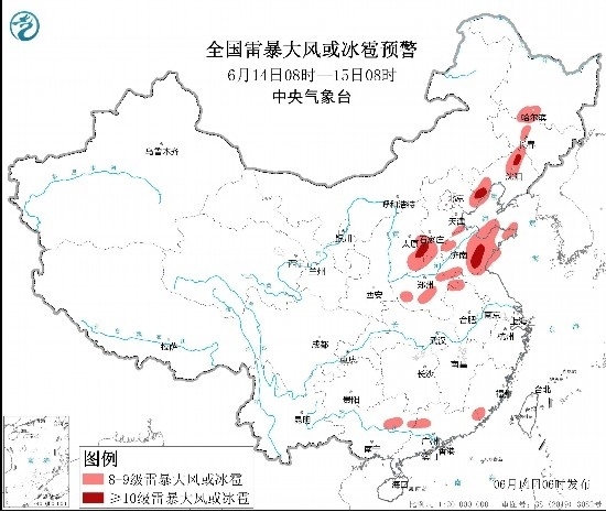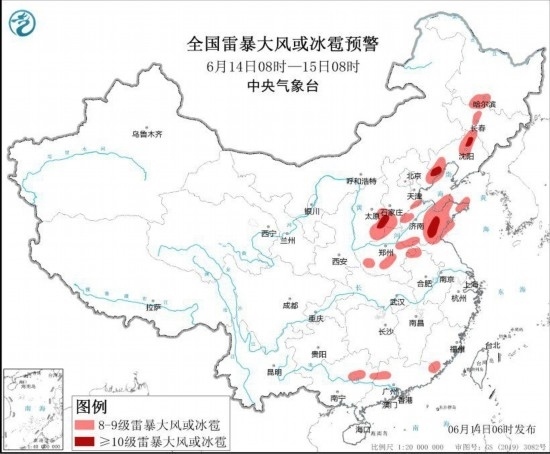 預(yù)計(jì)6月14日08時(shí)至15日08時(shí),黑龍江南部、吉林中西部、遼寧西部和北部、山西東南部、河北南部和東北部、山東中東部和南部、河南中北部和東部、安徽北部、江蘇北部等地的部分地區(qū)將有8級(jí)以上雷暴大風(fēng)或冰雹天氣,其中,遼寧北部和西部、山西東南部、河北南部和東北部、山東中南部等地的局地將有10級(jí)以上雷暴大風(fēng),最大風(fēng)力可達(dá)11級(jí)以上;渤海部分海域、萊州灣、山東半島附近海域?qū)⒂?~10級(jí)的雷暴大風(fēng)。黑龍江南部和中東部、吉林南部和西北部、遼寧中東部和西南部、河北東北部、山東中東部和南部等地的部分地區(qū)將有小時(shí)雨量大于20毫米的短時(shí)強(qiáng)降水天氣,其中,黑龍江中部、山東中南部等地的局地小時(shí)雨量大于50毫米,最大可達(dá)80毫米以上。預(yù)計(jì),強(qiáng)對(duì)流的主要影響時(shí)段為今天午后至夜間。中央氣象臺(tái)6月14日06時(shí)發(fā)布強(qiáng)對(duì)流天氣藍(lán)色預(yù)警(見圖2)。