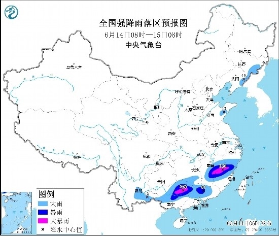 圖1 全國(guó)強(qiáng)降雨落區(qū)預(yù)報(bào)圖(6月14日08時(shí)-15日08時(shí))