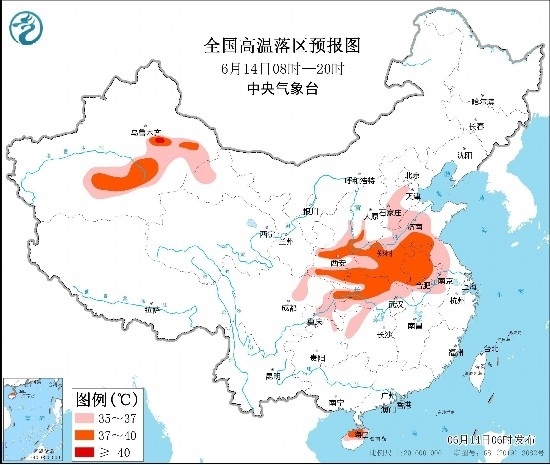 預(yù)計(jì)6月14日至15日,河北中南部、山西南部、陜西大部、黃淮、江淮、湖北北部以及內(nèi)蒙古西部、新疆南疆盆地等地有高溫天氣,局地可達(dá)40℃以上。