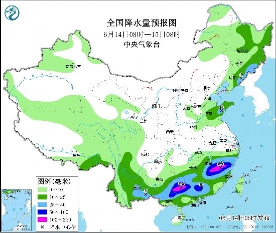 預(yù)計(jì),6月14日08時(shí)至15日08時(shí),江西中東部、浙江南部、福建西部和北部、湖南南部、云南東南部、廣西中北部、廣東中北部以及吉林東部、遼寧東北部、山東南部等地部分地區(qū)有大到暴雨,其中,江西東部、福建西北部、廣西東北部等地部分地區(qū)有大暴雨(100~200毫米)。上述部分地區(qū)伴有短時(shí)強(qiáng)降水(最大小時(shí)降雨量30~50毫米,局地可超過(guò)80毫米),局地有雷暴大風(fēng)或冰雹等強(qiáng)對(duì)流天氣。中央氣象臺(tái)6月14日06時(shí)發(fā)布暴雨黃色預(yù)警(見圖1)。
