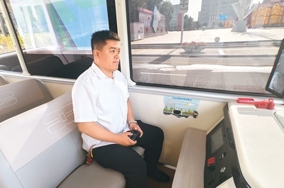此時(shí),四輛智能網(wǎng)聯(lián)觀光巴士正以自動(dòng)無(wú)人駕駛的方式,按照設(shè)定好的線路,在中軸線兩側(cè)的觀光道路上行駛。身為智能網(wǎng)聯(lián)汽車測(cè)試員的高瞳,坐在其中一輛巴士?jī)?nèi),雙手握著操作手柄,監(jiān)督車輛安全運(yùn)營(yíng)行駛。